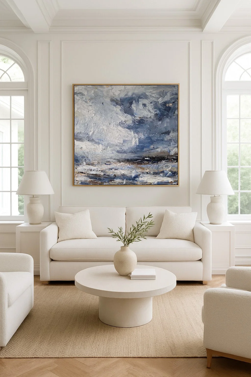 Once a painting reaches one metre or more, it begins to anchor a space. Large scale works create atmosphere and establish visual hierarchy within a room. They bring confidence and clarity to open walls.