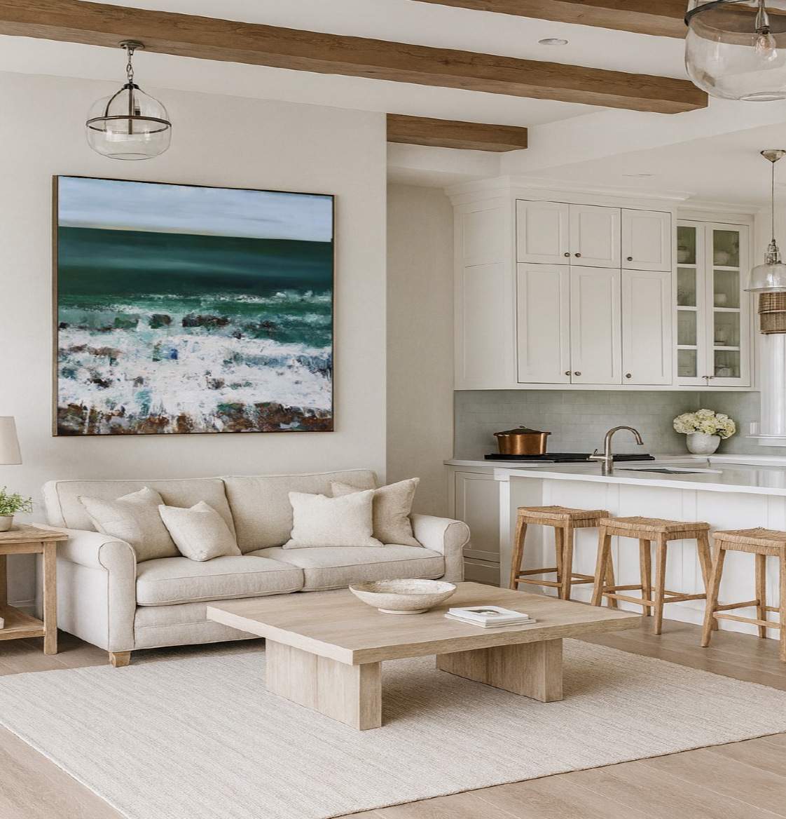 These works are chosen for their ability to create space within a room. Soft tonal shifts, expansive skies and layered blues and neutrals introduce calm while still carrying depth and presence. They do not demand attention yet they hold it.