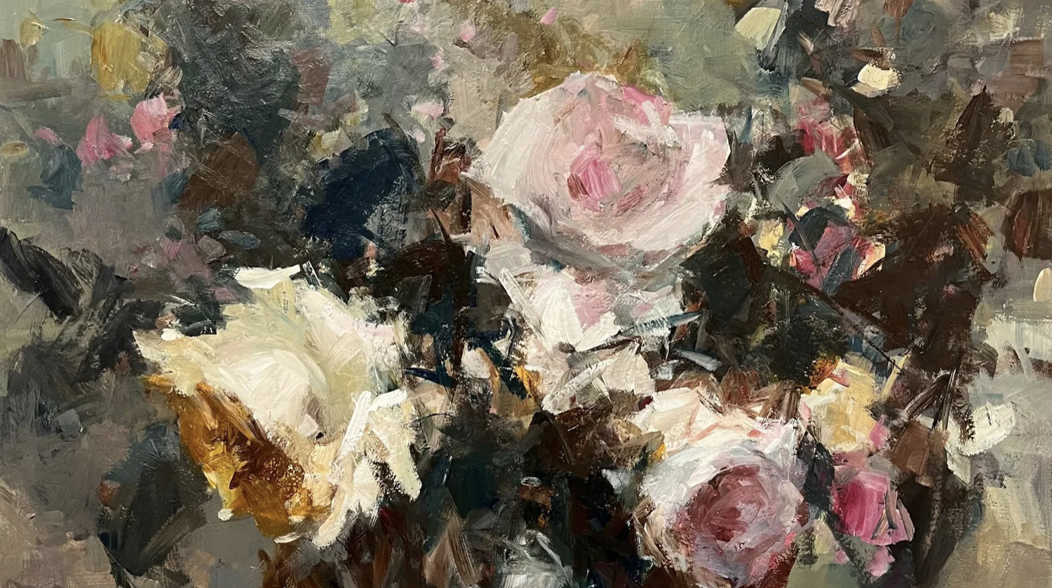Contemporary painter exploring memory and emotion through expressive landscapes and rose still life paintings suspended between realism and abstraction.